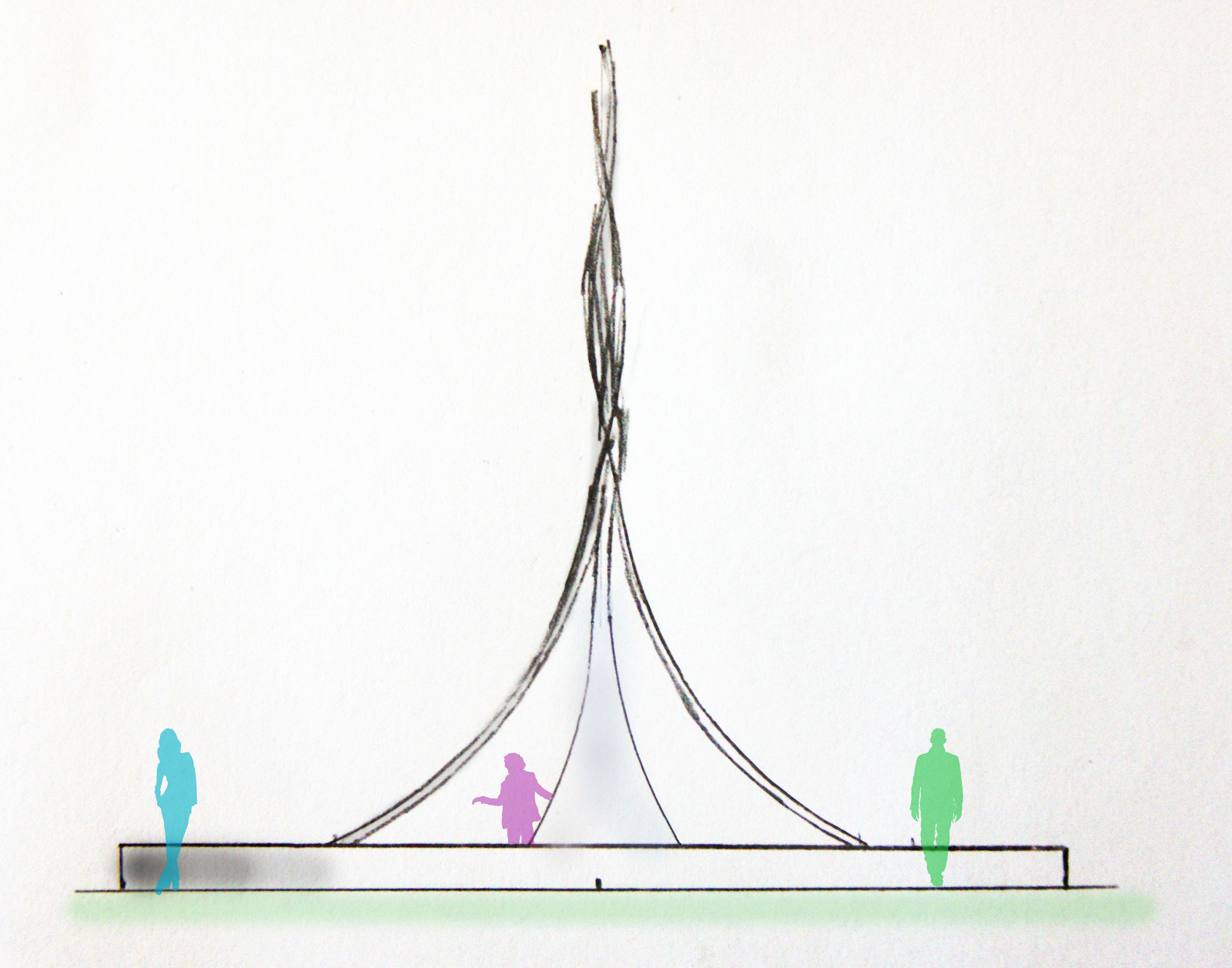 And now to the final element, the sundial. After several discussions with our professors and my classmates, I concluded that despite several active and monumental areas on the island, Hven didn't have a defined central area for meeting and activities and such. I decided therefore to define such a place by creating a monument of the sundial. The result was a sculptural shape, which featured four metal lines. Each of these lines pointed towards the four largest cities in the Øresund sound, where the island is located (Copenhagen, Malmø, Helsingør and Helsingborg). This was to illustrate that the island of Hven is in its way a center for the entire sound, despite its little size. This sculpture was furthermore placed in a low pool, where one would be able to dip one's feet for a little cool-down, and it would also be surrounded by a round bench that circles around the monument, in order to create a hang-out and meeting spot with seats and such. Above is a facade drawing of the monument, and below a plan.